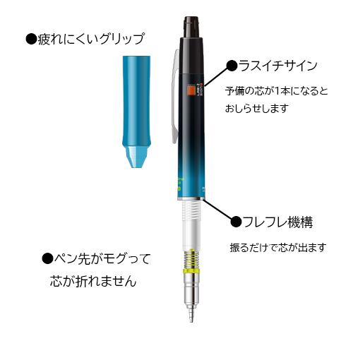 ・新機構「ラスイチサイン(LAS-1 SIGN)」は、芯タンク内の予備芯が残り1本になった時に軸の窓にサインを表示します。予備芯が残り1本の場合、筆記している芯が短くなると、ペン先に向かって予備芯が下に進み始めることで、芯タンク上部のパーツも予備芯に合わせて下にスライドし、窓の位置にサインを表示して突然シャープ芯が無くなることを防ぎます。